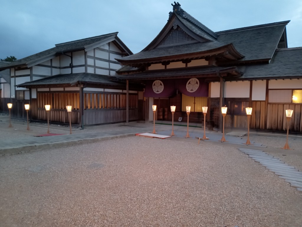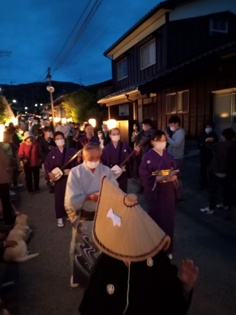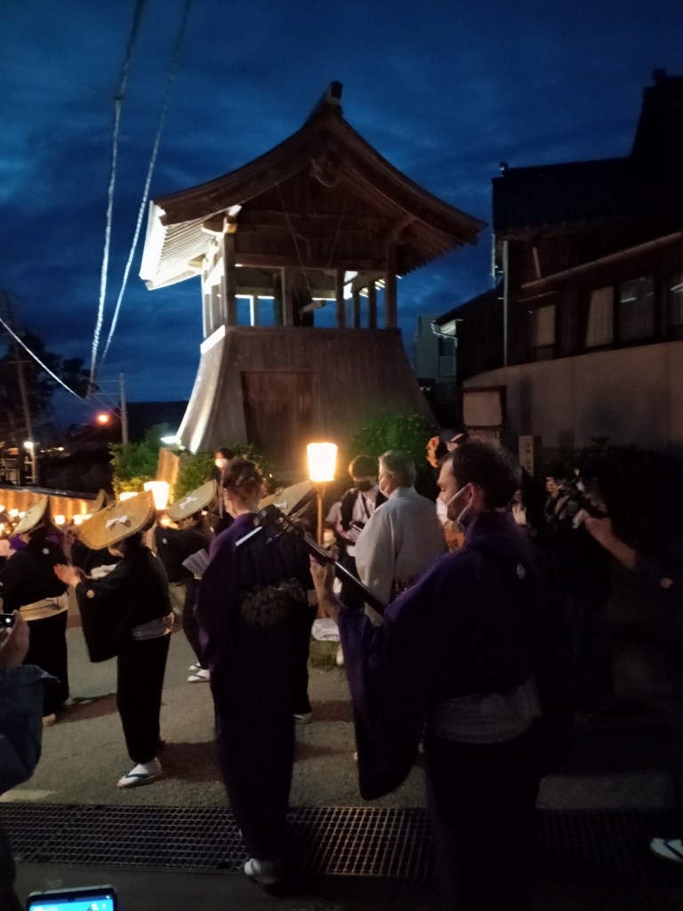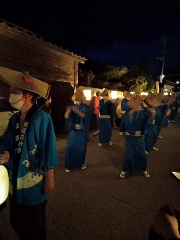 The actual dances started shortly after we arrived. I suppose it was somewhat like a parade. Various troupes of dancers slowly dance in procession, starting at the top of the hill, near the road to the gold mine and ending in front of the administrative building. The groups were organized with a lantern bearer in front, followed by the dancers, with chanters and musicians in the back. Every troupe had their own uniform of vibrant kimono, and the dancers also wore the traditional straw hat which obscured their faces from most angles. The dance is synchronized and the choreography contains a lot of very flowing, water-like movements, punctuated by a synchronized clap every few measures. There is an accompaniment by two shamisen players, a traditional Japanese stringed instrument that sounds a bit like a banjo. In the back there are a few singers, who chant a call and response song. I ran into some friends and coworkers and tried asking them what the meaning of the song could be. From most, I was unable to get a response as I was only told that it is in very old language and hard to understand or translate. I did meet a kind older woman who studied Sado history in college before moving and raising a family here. She was very helpful in explaining some of the traditions and history of the Aikawa Okesa. She told me the tradition is “only” about 400 years old. Supposedly, the lyrics were originally about all the rumors of the town: who was in a relationship with whom, who was having an affair, who was on deaths door, and so on. The governor of Sado didn’t like this gossip so he decided to have it changed to the modern iteration, where the chants are for things like asking for a bountiful harvest and success in war.