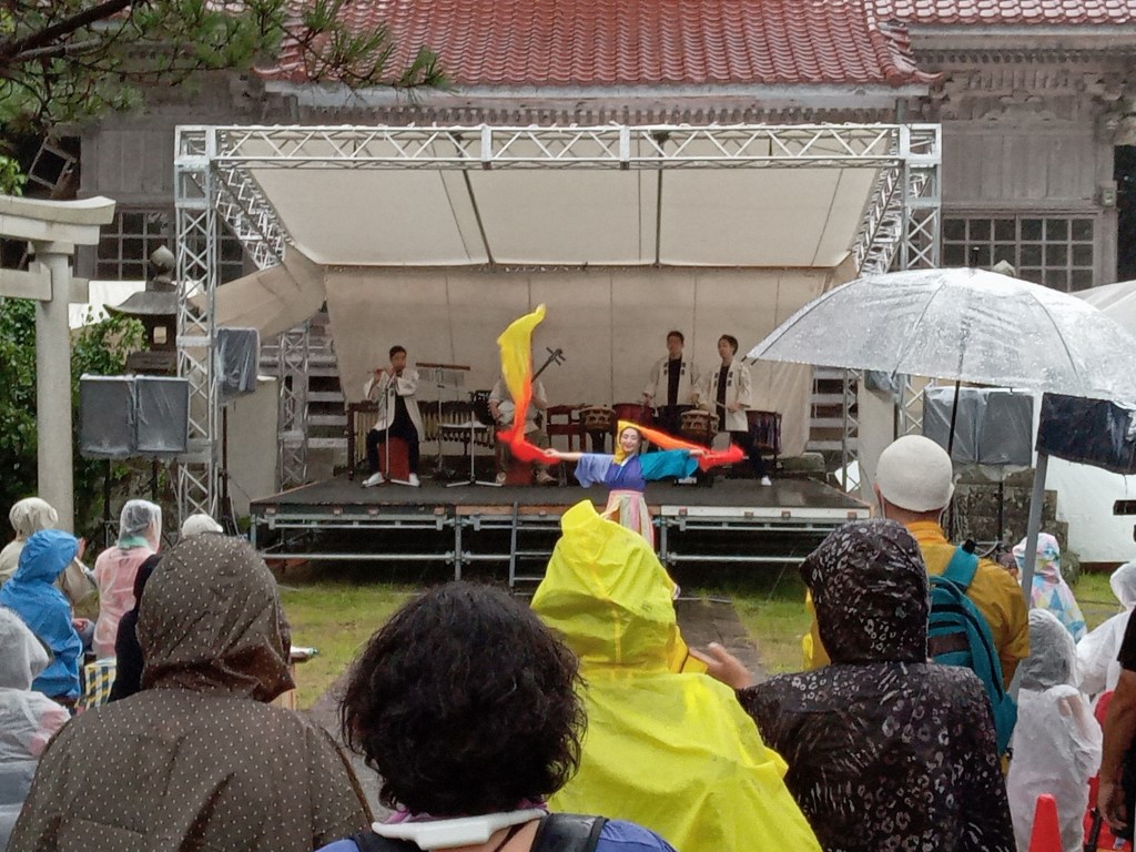 The festival took place in Ogi, a town on the southwest coast of Sado. I attended the performances on days two and three. The area centered around a park had been turned to an outdoor venue and festival. The festival had art and food stands from the mainland. There was also a second stage where some of the newer Kodo members performed before the main performance. They performed a sort of dance show with a talented artist named Chieko. It was a kind interpretive dance play. First she appeared dressed as a young woman, before a demon came and terrorized her while they danced around the stage to the drum beat. She left the stage and returned dressed as a sort of diviner, and engaged in a metaphysical battle to cast away the demon. It was a very animated and interesting performance, and it was easy to follow this story. After this warm up performance was the main event on the main stage. As soon as we sat down and the performance started, the clouds began absolutely pounding everyone with rain. It was futile to stop it and by the end of the show, I was completely soaked. Still though, I enjoyed the show. In fact, I found it somewhat appropriate that a celebration of the Earth would be marked by the presence of heavy rain. Anyway, the performance was fantastic. It isn’t just drums but also includes flutes and other traditional Japanese instruments. You really get a sense of the physical shape of these drummers. For one thing, their costumes are quite revealing of the bodies they tone through intense training. During the show they glisten with sweat from beating a drum at a sustained rate. Their coordination was excellent as well as their synchronicity. The feeling of the bass drum sound waves hitting your chest was exhilarating.